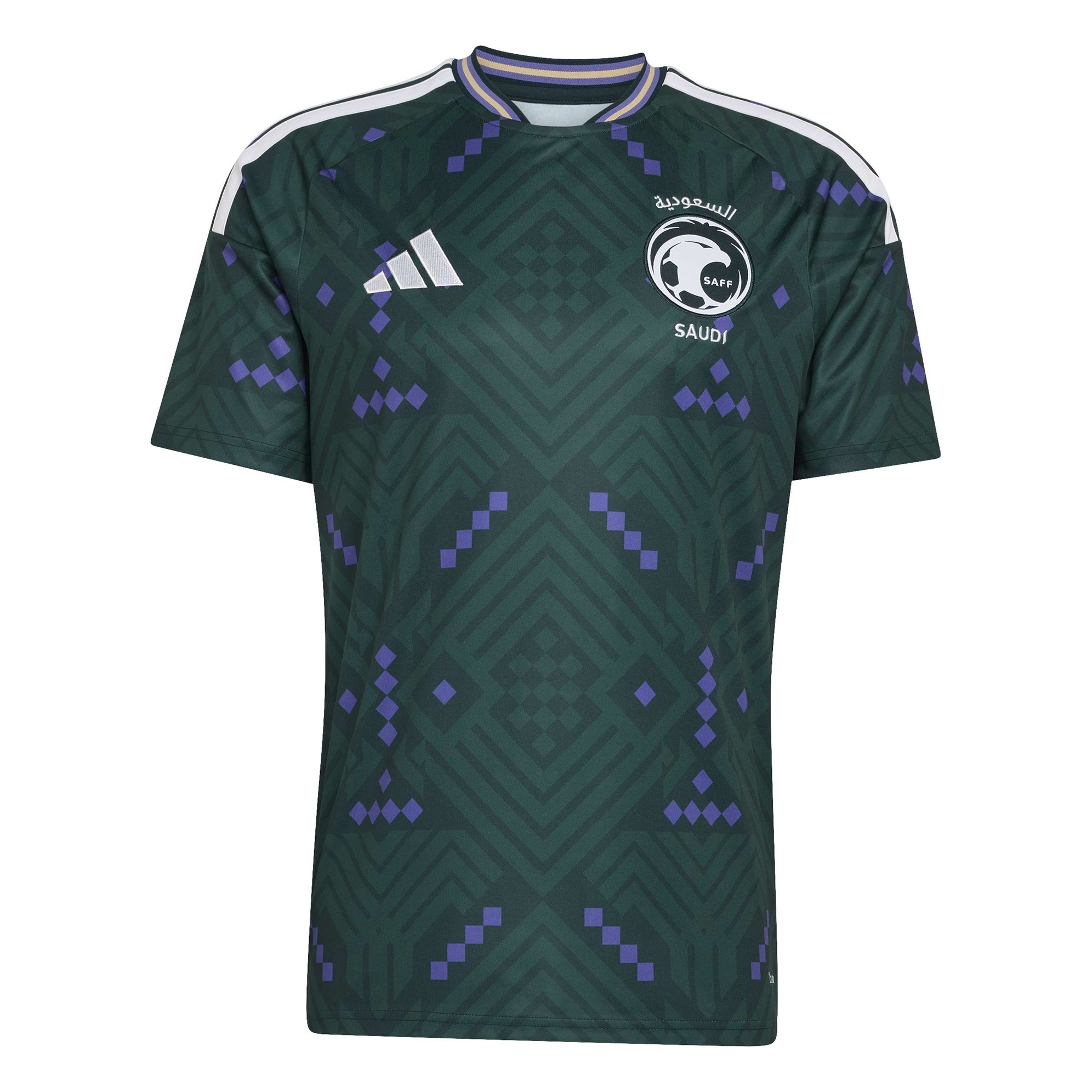 "Inspired by the country’s rich cultural heritage, the Saudi Arabia 26 Home Shirt combines traditional art with a modern twist. The dark-green base is accentuated with hits of purple, creating a striking look. This shirt is crafted with Climacool breathable materials that aid cooling for match-day comfort. The interlock fabric further provides a comfortable fit, while the slim design offers a sleek silhouette. The embroidered adidas logo and club crest are displayed proudly with more than a touch of class. Whether you're cheering from the stands or playing a match, show your support for Saudi Arabia in style with this authentic shirt."